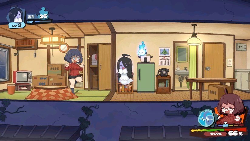 简中《来闹鬼吧!小怨怨》是一款“干涉介入+陪伴型”电脑游戏。玩家将扮演公寓里的地缚灵“小怨怨”,因住户野吕井小姐惨遭杀害,公寓面临拆除,失去栖息之所的小怨怨也将彻底消散。为改变命运,小怨怨在“小魂火”建议下穿梭于房间的过去与现在,在野吕井小姐入住到案发的一个月里,利用每天她回家到就寝的3小时干预时间,通过拍打家具、用念力制造微小“异常”等方式引导她察觉房间不对劲。成功吓到对方可获取经验值,提升引发“异常”的数量,以此改变关键事件,既拯救野吕井小姐,也保住自己的栖身之地。
