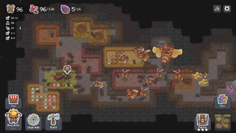 你扮演蚁后并发展蚁群。蚂蚁无法直接操控,但你可以召唤、升级、发动突袭,最重要的是挖掘并建造地牢。目标是摧毁所有敌方基地。如果蚁后死亡,游戏结束。