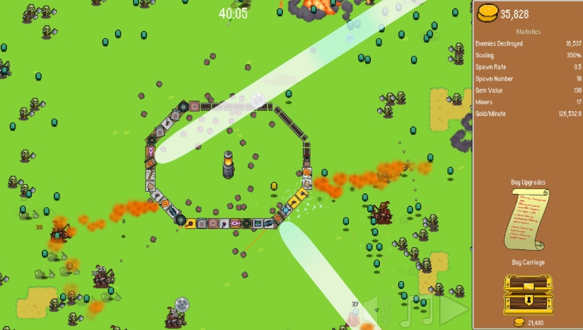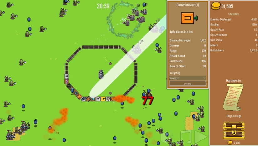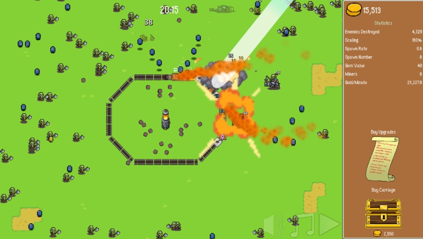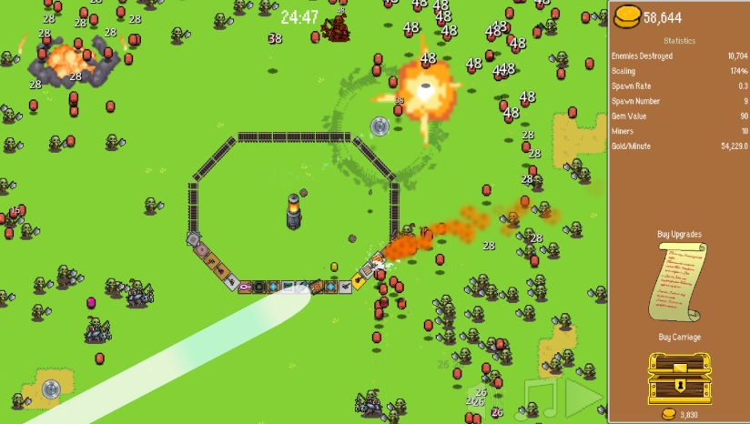 游戏巧妙融合了自动战斗、塔防、生存以及挂机/点击元素,创造出独特的策略体验。玩家的主要操作是花费金币购买两种核心车厢:防御车厢(如火焰喷射器、狙击炮、加农炮)和能产生资源的经济车厢。游戏的核心机制在于“三合一合成”升级系统:购买3个相同类型和等级的车厢,可以合成一个更高级的车厢,从而大幅提升战斗力,且升级潜力无限。资源管理至关重要,你需要合理分配金币,提升宝石价值,甚至雇佣矿工来实现自动化生产。战斗中,兽人会掉落“门票”,用于解锁永久性强化;而每隔5分钟或15分钟出现的强大首领则会掉落“遗物宝箱”,提供持续整局的强力增益。