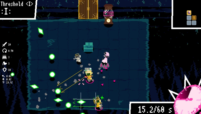 简中《时间掠夺者亨迪(Time Snatcher Handy)》是由PulleyBun和ClockworkCats开发,Cometsoft Inc.发行的一款惊险刺激的时间暂停弹幕逃脱动作Roguelike游戏,支持简体中文。玩家将化身猫咪怪盗“亨迪”,潜入时间博物馆偷取“时钟指针”。在过程中,玩家需要躲避警卫兵的密集弹幕攻击,并利用“时钟指针”赋予的暂停时间能力,穿梭于弹幕之间发动突袭。游戏核心为时间暂停机制:暂停时间、购买道具或受到攻击都会消耗时间,而攻击敌人可以夺回时间。游戏采用复古的2D像素艺术风格,场景细节丰富,角色动作流畅,唤起玩家的怀旧情怀。