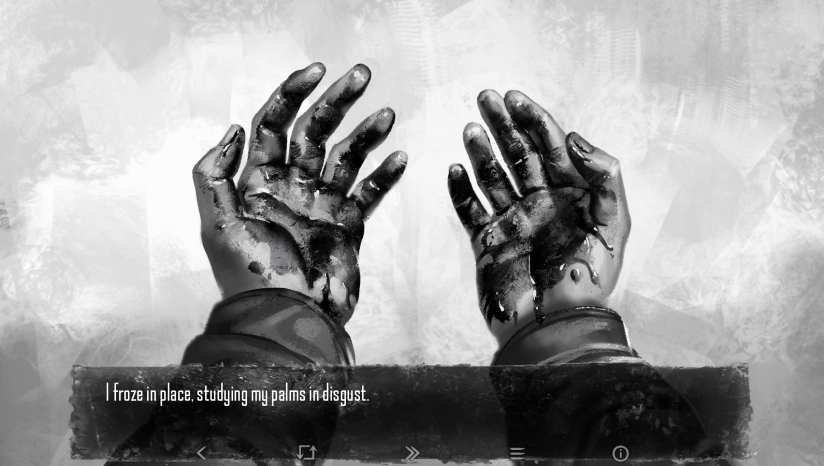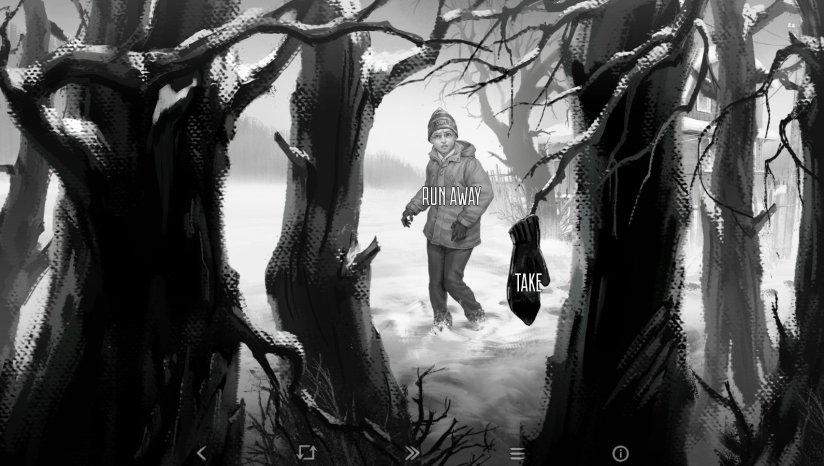 游戏采用全单色手绘风格,以黑白灰三色构建出类似碳素素描的独特视觉效果。画面强调明暗对比,例如苍白的雪地与深黑的森林形成强烈视觉冲击,突出孤立无援的压抑氛围。角色设计虽简洁,但通过精细的面部表情与肢体动作刻画心理状态,如主角安东的恐惧与迷茫。场景转换搭配动态CG插图(如飘雪、窗帘晃动)增强叙事张力,而仿老旧胶片的颗粒质感进一步烘托出复古诡谲的基调。