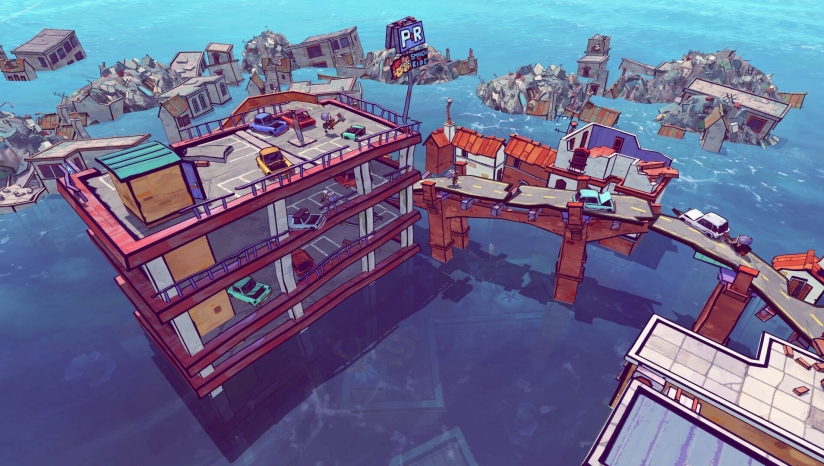 游戏采用明亮的卡通渲染风格,搭配轻快的海洋风配乐,营造出“末日废土中的治愈感”。虽然主题是劫后余生,但整体画面色彩鲜艳、氛围轻松,与传统的黑暗废土风格形成鲜明对比。游戏世界充满活力,高大的废墟、水下城市和珊瑚礁等环境细节丰富,那里到处是海洋生物和垃圾,营造了一个既奇幻又真实的洪水世界。这种视觉风格与游戏关于重生和希望的潜在主题相得益彰。