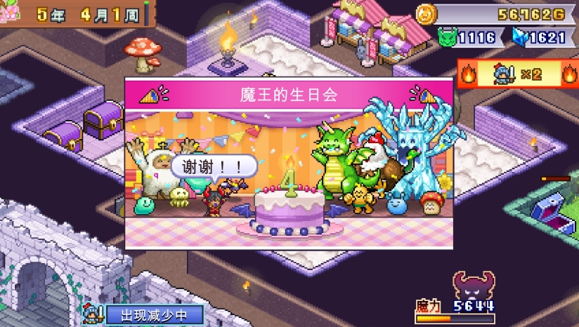 简中《魔王城物语》是开罗游戏推出的像素风模拟经营电脑游戏,已上线Steam平台。游戏打破传统勇者叙事,玩家化身魔王接手破败城堡,通过自由布局迷宫、布置石像鬼雕像与催眠瓦斯等陷阱构建防御,招募50余种基础魔物并通过合成解锁300种进化形态,打造专属战斗团队。融合Roguelike随机挑战与沙盒探索玩法,冒险者入侵路线随机生成,魔物可外出探索地下城获取资源与新伙伴,离线挂机也能持续收益。
