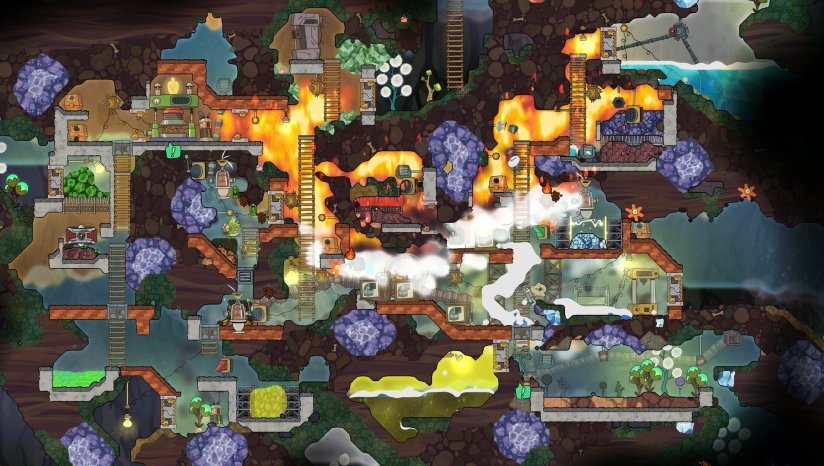 游戏延续了科雷标志性的手绘美术风格,以2D横版卷轴视角呈现动态生成的异星环境。场景细节丰富,如液体流动、火焰燃烧等效果均通过精细的动画表现,搭配实时演算的光影变化,营造出既熟悉又充满科幻感的视觉体验。尽管玩法转向动作导向,但画面仍保留《缺氧》的微观模拟质感,例如金属快速传热、土壤保温等特性均通过视觉化反馈增强沉浸感。