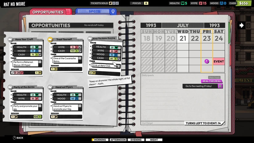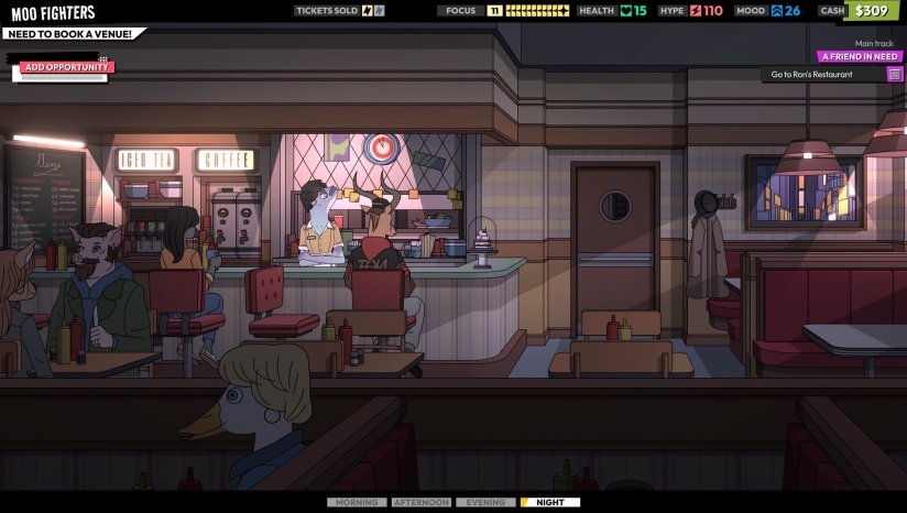 《歌兽经理》是一款以90年代另类摇滚文化为背景的乐队管理角色扮演游戏。游戏将玩家带回到1993年,那个MTV黄金时代、摇滚圣歌回响的岁月。玩家将扮演一位乐队经理,带领一支挣扎求生的地下摇滚乐队从地下室演出开始音乐生涯,最终目标是登上世界舞台。游戏世界设定在一个由夸张拟人化角色组成的另类美国,充满了疯狂与真实并存的氛围。在这里,你不仅要面对音乐产业的挑战,还要处理乐队成员各自的人生难题,体验一次次在艺术理想与现实妥协之间的艰难抉择。