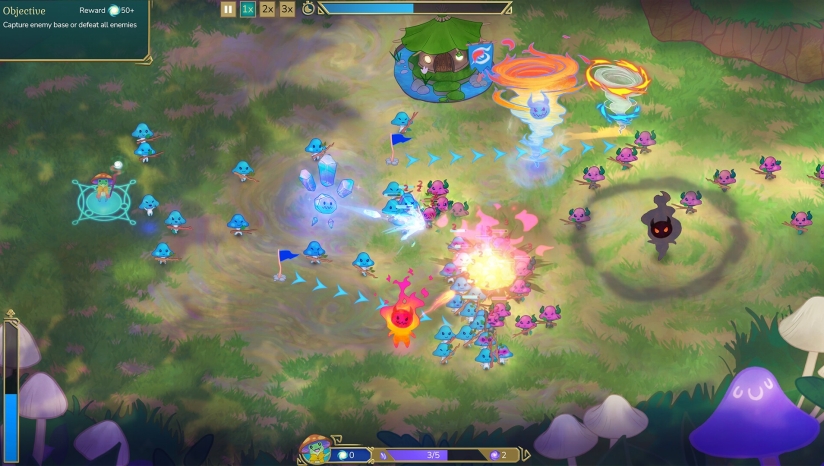 《秘林之外》采用上帝视角的2D画面,以精致的艺术风格呈现奇幻世界。游戏场景涵盖从茂密丛林到腐化之地的多样环境,其界面设计清晰展示了魔像合成系统与战斗指挥的直观性,确保了策略游戏的视觉清爽与操作便捷。