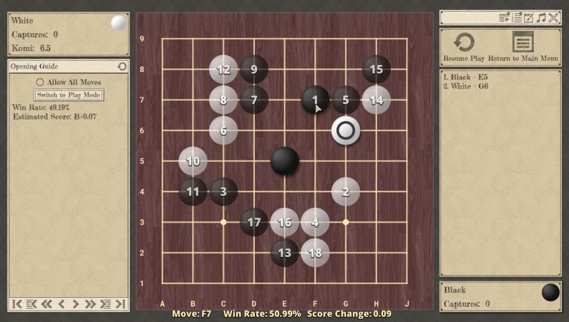 游戏内的AI能够自动调整难度等级和让子数以匹配玩家水平,最高难度甚至可与职业棋手较量。玩家可随时开启AI分析功能,查看最佳落子建议和胜率评估。
