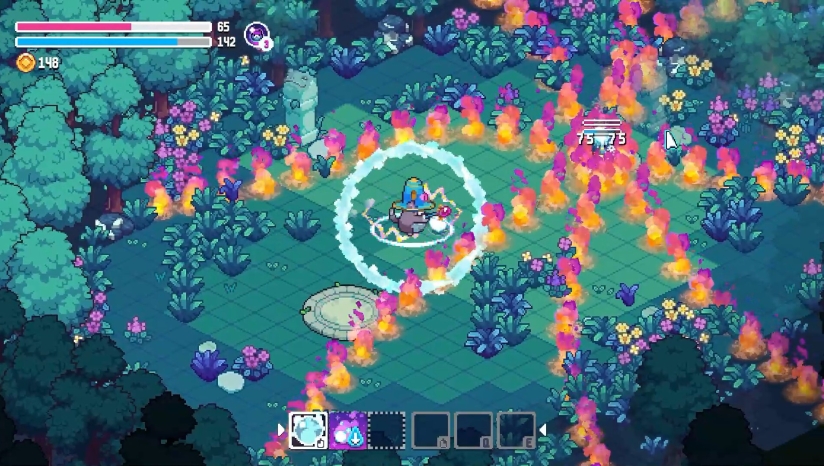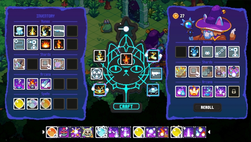 《大猫贤者的无限法典》是一款融合了Roguelike与“魔法编程”的创新游戏。游戏采用21轮次的爬塔闯关模式,核心玩法围绕“战斗-养成-策略组合”展开。玩家通过逐层击败敌人获取金币,在商店中购买元素符文、增强符文、秘遗和断片等道具,通过自由搭配创造出独一无二的魔法。游戏最具特色的“咒语引擎”系统,将魔法拆解为元素符文(火焰、雷电、冰霜等)和增强符文(追踪、炮塔、五重等)。玩家通过7个符文槽位自由排列组合,创造出完全原创的法术。例如,你可以将火焰化为移动护盾,或使冰霜构筑通天的阶梯。