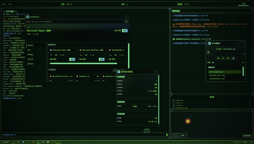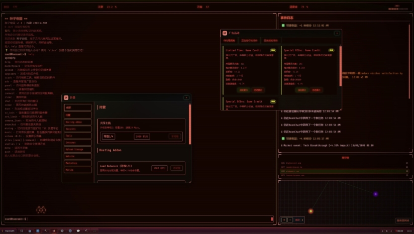 游戏的核心玩法基于终端操作,提供了高度沉浸式的模拟体验。您需要平衡多方因素来确保网站的可持续发展:破解新发布软件、管理服务器资源、调整网站策略以及应对各种突发状况。您需要谨慎规划网站发展策略——如果扩张过快或不够谨慎,可能会引起当局的注意;但如果忽视用户需求,访问者便会流失。随着游戏进展,新的软件会发布,技术会更新,您必须相应调整策略,在风险与回报之间找到平衡点。游戏包含经济系统,您可以通过广告盈利(选择横幅、弹出窗口或误导性广告等不同形式),也可以接受黑客任务渗透公司服务器获取额外收入。同时,您还需要升级基础设施,从最初的拨号上网和有限存储空间,逐步提升到更先进的设备。