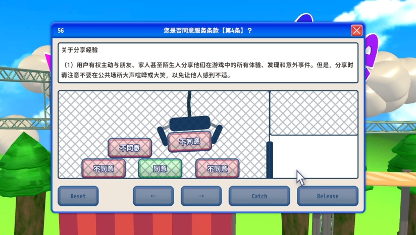 核心玩法是通过各类迷你游戏完成每条协议的“同意”操作:需像抓娃娃机般精准操控获取同意按钮,在弹幕雨中躲避障碍,用砖块消除开辟通路,还需破解拼图、迷宫运钥匙、物理弹射等多样关卡。任何失误(误点拒绝、超时)都将重置至第一条协议重新开始,极度考验耐心与集中力。
