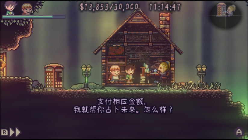 本作的核心是探索驱动的玩法。与传统类银河战士恶魔城游戏不同,它并非要与巨型恶势力对抗,主要目标是在规定时间内偿还父亲留下的债务。玩家需要在阿罗斯提亚小镇中奔波,通过多种方式收集资金。游戏提供了多样化的赚钱途径:完成高难度试炼关卡、触发事件、中彩票、赢得赌局、玩迷你游戏或击败对手等。玩家可以自由选择适合自己的通关策略。游戏采用了典型的银河城式箱庭地图设计,整个迷宫呈回环网状结构,各区通过多向通路相互连接。地图中有各种“能力锁”,需要解救特定伙伴或获得道具才能通过。