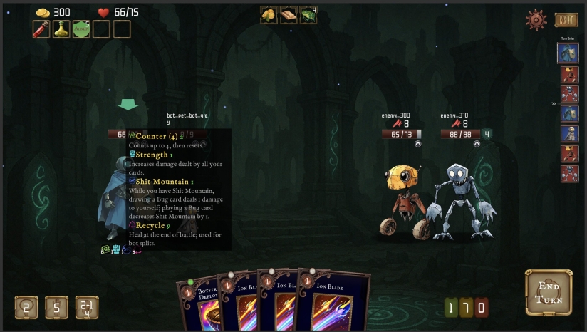 游戏采用暗色调幻想风格,通过色彩对比突出魔法仪式与战斗特效的视觉冲击。召唤物的动作设计兼具个性与张力,而程序化生成的地图与动态光影进一步强化了世界的混沌感。界面设计简洁直观,卡牌与遗物的图标辨识度高,帮助玩家在复杂战局中快速把握关键信息。