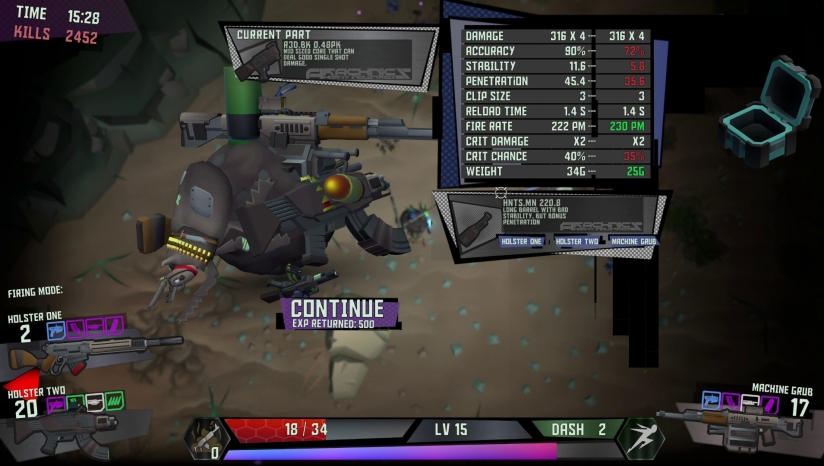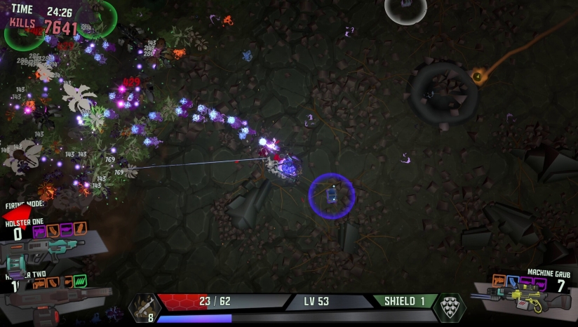 《枪螂》最引人注目的特色是其多样化的武器定制系统。游戏中每个武器由4个不同的组件构建,玩家可以根据自己的喜好和游戏风格来定制专属武器。游戏内引入了8个不同的武器制造商,每个制造商都为玩家提供独特的武器部件,并且拥有特殊的能力或修饰器,通常专注于特定的组件。这种设计让玩家可以尝试多种不同的构建策略。游戏还采用了渐进式教程系统,通过几次游戏运行逐步提供信息,而不是一次性将玩家扔进复杂的系统中,降低了上手门槛。物理控制效果也是游戏的一大亮点,双摇杆控制提供了精准的操作反馈,让玩家能够享受弹幕射击的快感。