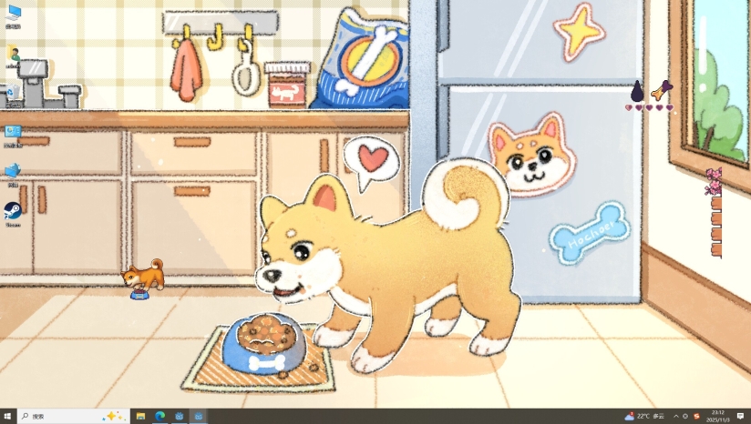 《我的桌面小狗》(My Desktop Puppy)是Friday Game开发制作的一款结合宠物养成、互动陪伴与轻量娱乐的桌宠游戏,让你的屏幕从此不再孤单,未来将上线steam平台。一只会悄悄陪伴你的桌面小狗。你工作时它安静待在一角,你想放松时它会主动来互动,还会轻轻蹭你撒娇。带它去散步、送它喜欢的玩具和小背带,看它因为你的关注露出开心的样子。全界面可拖动、支持桌面穿透,不会影响你的操作。积累好感度,获得来自不同画师的精美的绘图与壁纸!