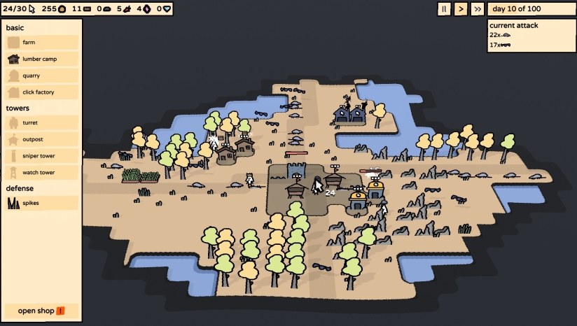 《点击大陆》(Clickyland)是由Sokpop Collective发行的PC端策略塔防+村庄建造游戏。游戏核心围绕“点击”展开,玩家需通过点击获取木材、石材等资源,攻击野兔、巫师等30余种敌人,探索迷雾地图,守护城堡存活100天。每日点击次数有限,需策略性建造采石场、点击工厂等35+可解锁建筑与升级,提升资源获取效率与防御能力,管理站等设施还能优化操作流程。程序生成的关卡带来新鲜感,约4小时游玩时长,融合资源管理与塔防布局,既考验规划能力又不失趣味,适合喜爱轻量化策略游戏的玩家。
