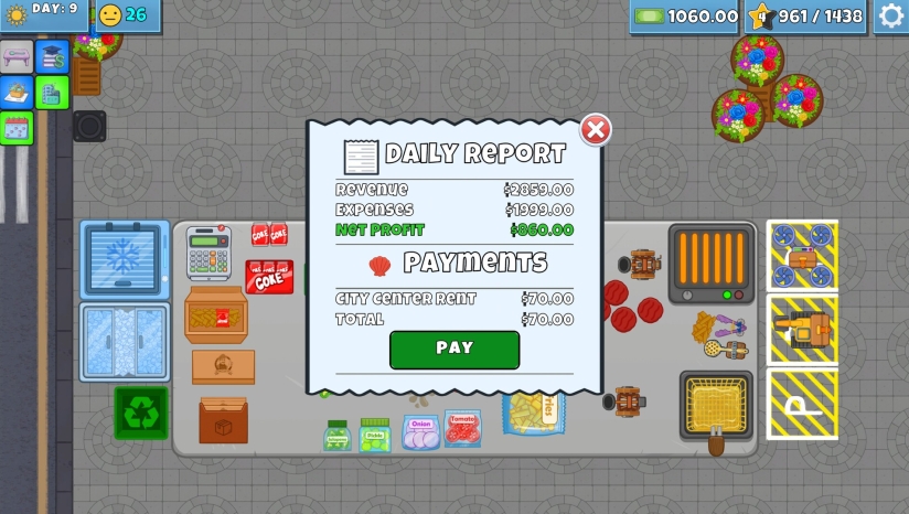 快节奏经营:每日需支付租金,赚取的钱用于购买食材和支付租金。