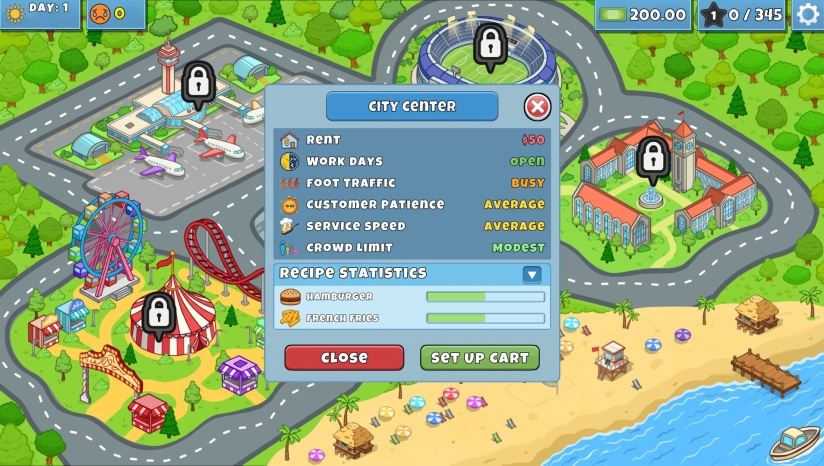 从繁忙的市中心广场到嘉年华场地,从大学校园到机场,您将面对各行各业的客户。接受他们的订单,准备食物,管理你的库存,并尝试以盈利结束一天。