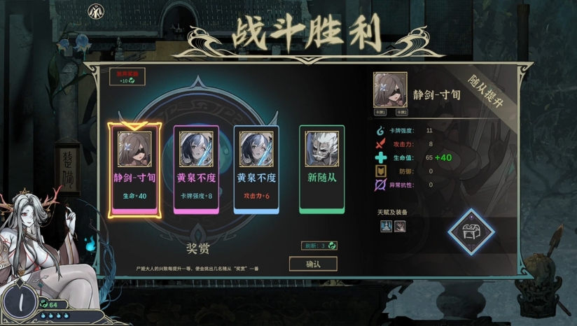 《尸姬之梦》是一款融合了Roguelike元素的策略卡牌构筑游戏。核心玩法围绕“傀儡+卡牌的双重构筑”展开,玩家可招募28位能力各异的随从,如僵尸娘绣锁、亡国姬蓝烟等。每个随从拥有专属天赋和技能卡牌,搭配100多种法宝装备,可构建攻击流、控制流等多种流派。游戏包含五大主线战役和十个特殊试炼关卡。战斗采用回合制策略,玩家需合理运用灵力积累系统和阴文强化系统。高风险高回报的挑战机制允许玩家在战斗前选择随机难度提升,以换取更丰厚的奖励。即使随从在战斗中被击倒,只要游戏进程尚未结束,尸姬大人就可在下一场战斗将其复活。