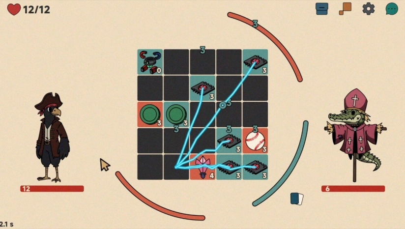 战斗发生在一块5*5的棋盘格中,卡牌依次进场后双方轮流进行操作,回合结束结算伤害。对手同样具有极具特色的构筑,以及不俗的智慧,有时你也能从他们那里学到有趣的技巧。