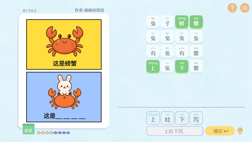 游戏采用类似《汉兜》的规则,提示读音和字是否在正确答案中出现、位置是否正确,在 8 次猜测中逐渐接近正确答案吧~