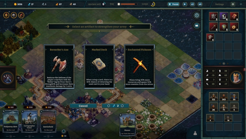圣杯神殿周围的土地荒芜而空旷,等待着被占领。你可以从森林和山脉中采集资源,建造要塞以招募军队,摧毁敌方据点,发现强大的地块组合,等等。但请注意:你变得越强,敌人阻止你的意志也会越猛烈。