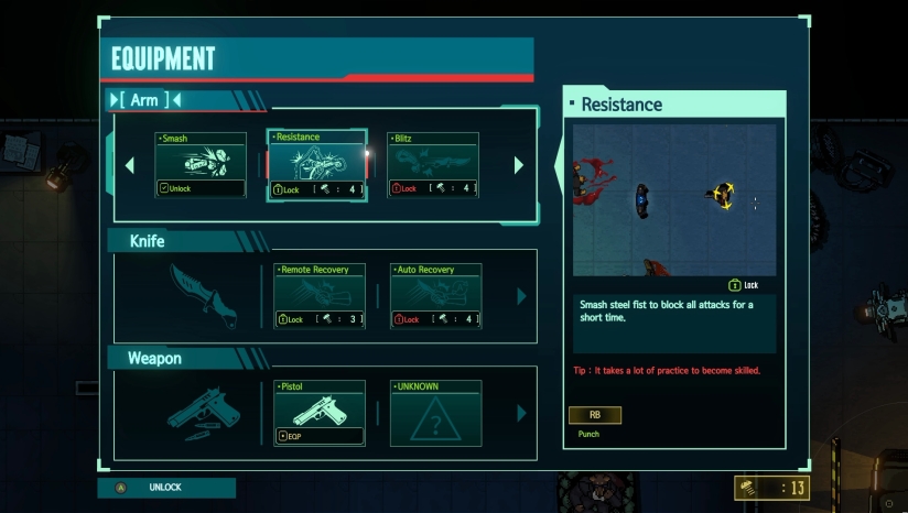 游戏的核心玩法是快节奏的俯视角动作射击。玩家主要借助一套名为“战斗之手”的军用战斗义肢、能够自动瞄准的“量子刀”以及各类枪械来消灭敌人。战斗强调策略与技巧的结合,需要玩家在枪林弹雨中慎重选择位置,并在恰当的时机组合运用拳头、飞刀和枪械,形成无懈可击的连续攻击。游戏包含成长要素,玩家可以通过击败敌人收集螺栓,用以升级装备、解锁新的武器和更强大的动作。整个过程旨在提供一种迅速而优雅的战斗体验。