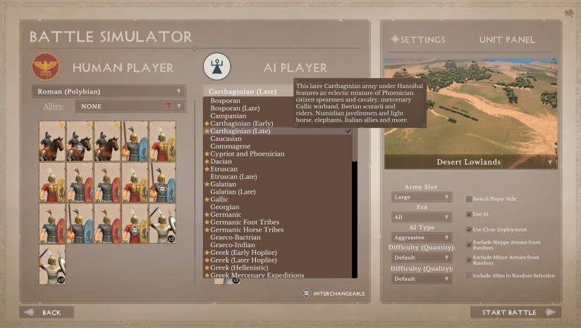 游戏最突出的特色在于其丰富的势力与单位选择,涵盖120余种势力和250余种军事单位。与前作相比,本作战场规模扩大30%,并强化了地形战术影响与士气系统 。指挥模拟体系极具硬核感,精准还原古代战争中命令传递、士气管控的真实逻辑。游戏还提供高度的自定义自由度,支持按时代、军队类型筛选随机势力。