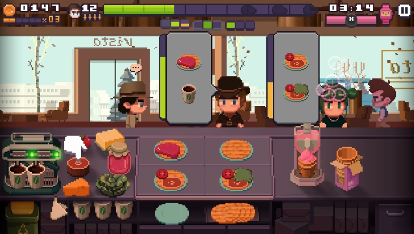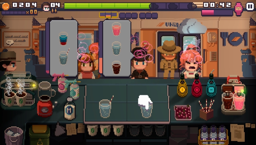 《Pixel Cafe》的核心玩法分为两大模块:时间管理模拟和视觉小说叙事。在时间管理部分,玩家将经历Pixel在10个风格迥异的酒吧工作的职业旅程。玩家需要学习咖啡制作技巧和烹饪技术,适应不同的工作环境,满足顾客需求。游戏中有常规关卡和50个可选的噩梦关卡,后者提供地狱级的难度挑战。
