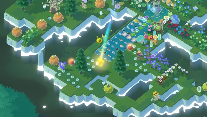 游戏核心玩法围绕种植作物、收获水晶与扩展版图展开。玩家从小小的方块岛屿起步,通过种植魔法蘑菇、多肉植物和各色花卉等可爱作物,收获充满能量的水晶。这些水晶可用于解锁新植物品种并扩展领地。游戏包含丰富的辅助系统:钓鱼系统允许玩家在岛屿各处钓起各种鱼类,挑战体型纪录;居民系统通过树洞招募四种不同种族的居民,每只居民都有独特外观与性格,会以不同方式协助生产。游戏既支持持续操作的深度游玩,也提供完整的放置玩法,让玩家能根据自己节奏体验。