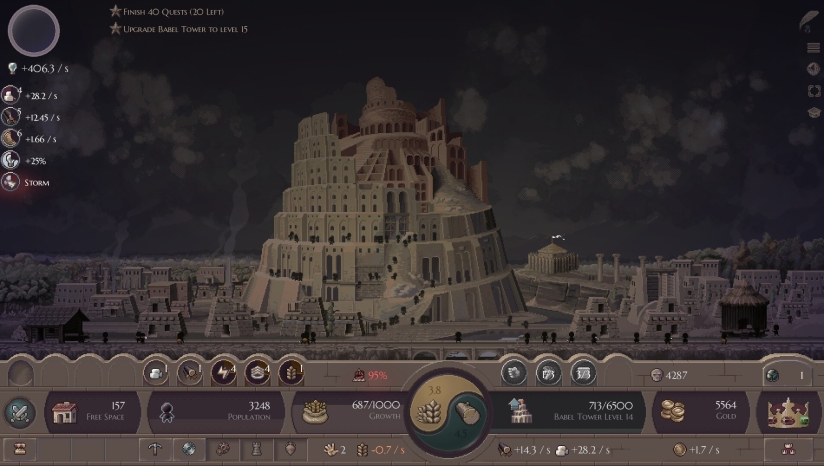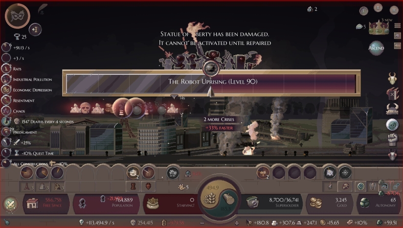 《微文明》的特色在于其深度的策略选择和丰富的游戏系统。玩家可以自由选择发展路径:是通过高强度点击压迫人民,还是依靠工作坊实现被动发展。游戏内含英雄收集系统,英雄作为可装备的增益物品,能对产业的各方面产生积极影响。随着进程推进,玩家可以合并英雄提升其能力,形成良性循环。独特的扬升之树结构为游戏增加了重复可玩性,多个难度等级的挑战带来新功能、更强敌人和更强大英雄。灾难系统并非完全随机,玩家可以预见并规避风险,例如无人居住的房屋易着火,过度拥挤可能引发疾病。