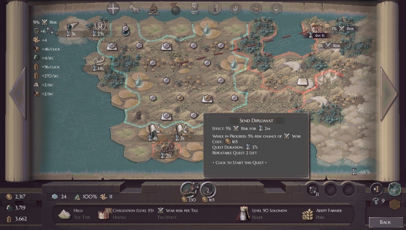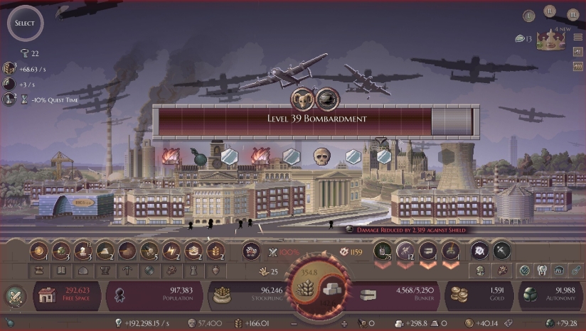 这款游戏的核心玩法结合了点击操作与自动化发展。初期玩家需要通过点击按钮获取基础资源如食物,促进人口增长;随着文明进步,将出现工人阶层,可自动完成部分生产任务,缓解玩家的操作压力。游戏采用非线性成长系统,人口与经济不会简单线性增长,而是需要玩家平衡资源分配与风险管控。科技树系统让玩家可以用研究点数解锁新建筑与功能,推动文明进化。当完成前期积累后,游戏还会引导玩家解锁军事单位,开启远征系统,通过完成不同地区的任务获得额外奖励。
