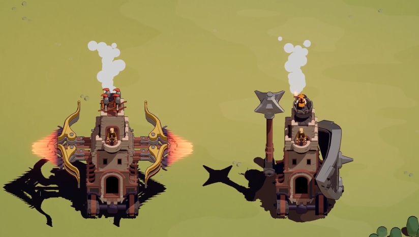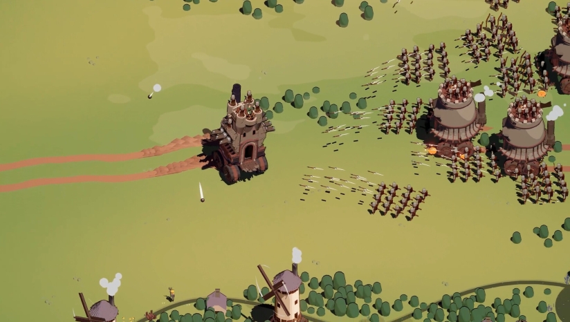 《Wanderburg》构建了一个充满想象力的“车轮上的城堡”生态系统。游戏背景设定在一个类似中世纪弱肉强食的世界中,玩家将扮演一座移动城堡的操控者,在程序生成的开放世界里探索。这片土地上,掠夺性的堡垒像鲨鱼般巡游,狩猎宁静的村庄,形成“总有更大威胁”的生存链。世界观融合了奇幻与蒸汽朋克元素,例如骑自行车的骑士、蒸汽动力攻城引擎以及像海盗船一样侧舷开火的城堡,营造出技术混搭的独特氛围。