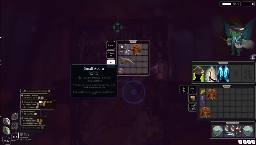 本作核心玩法融合了鼠标点击解谜与角色成长机制。玩家通过每一次点击操作唤醒自然之力,解开遍布森林的谜题。游戏采用类似《Cookie Clicker》的点击机制,结合《Vampire Survivors》的技能发现方式和《Diablo》的战利品系统。玩家可以收集各种神秘文物,包括古老法杖、叶子披风与麋鹿骷髅等,通过清理森林垃圾获得森林的感激回馈,逐步强化自身能力。在"森林圈"系统中,玩家需要管理多位树灵赋予的技能组合,策划最优战术以最大化解谜效率。