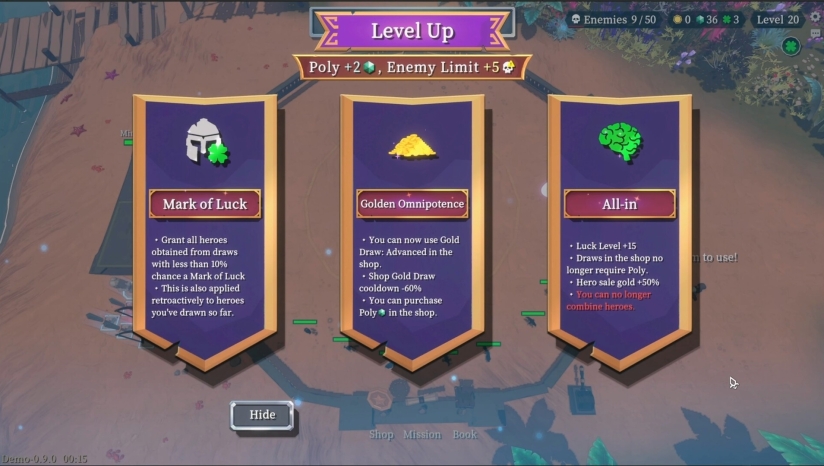 采用低多边形美术风格,以简洁几何图形为核心视觉元素,界面干净直观,战斗效果清晰易懂。色彩搭配协调,无多余视觉杂讯,能让玩家聚焦战场布局与英雄操作,多边形角色与场景随战斗动态呈现,兼顾视觉体验与玩法适配性。