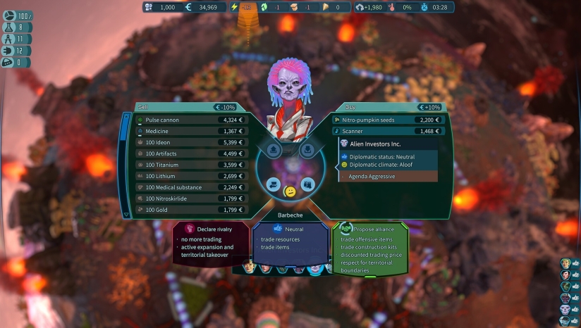 贸易资源和技术:商人和技术贸易商组织星际贸易,他们很乐意购买你从你的领土上开采的所有矿物和资源,同时出售昂贵的技术。盟友殖民地和居住在某些星球上的外来部落也是如此。