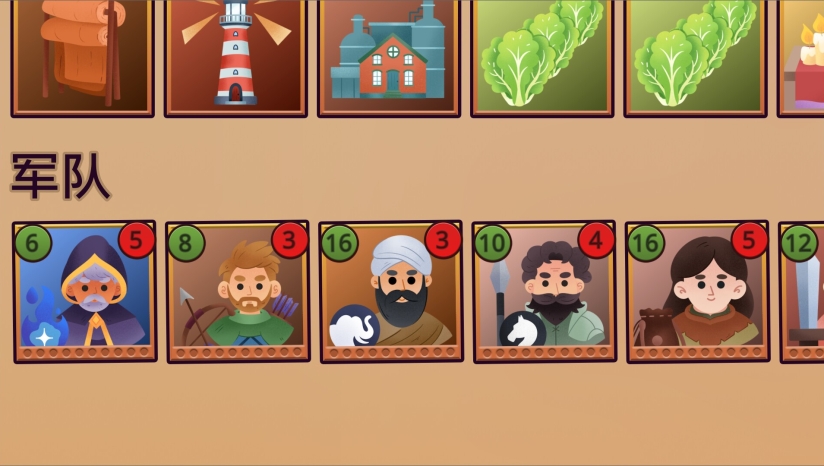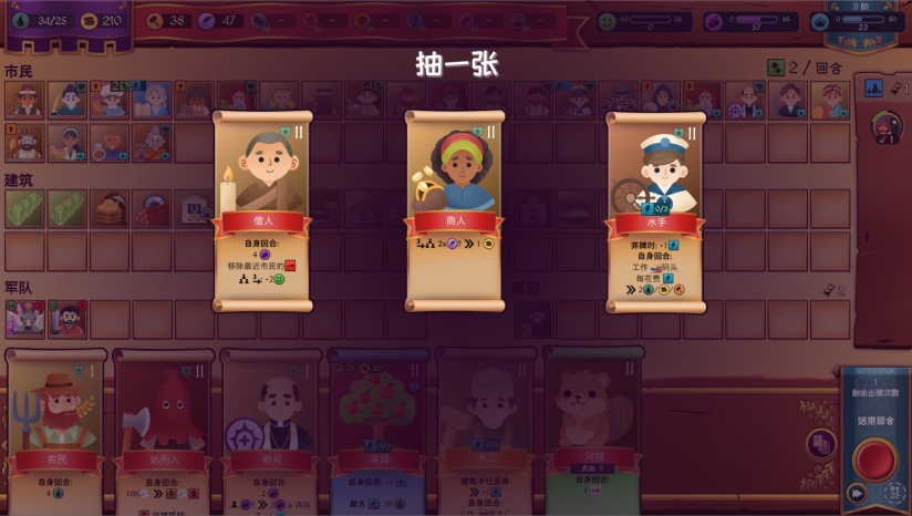 游戏采用2D画面,风格简洁明快,侧重于清晰展示卡牌信息与建筑、市民的布局效果。虽然不以逼真的视觉效果取胜,但其界面设计能够直观反映资源产出与连携关系,使玩家能够专注于策略思考与规划。