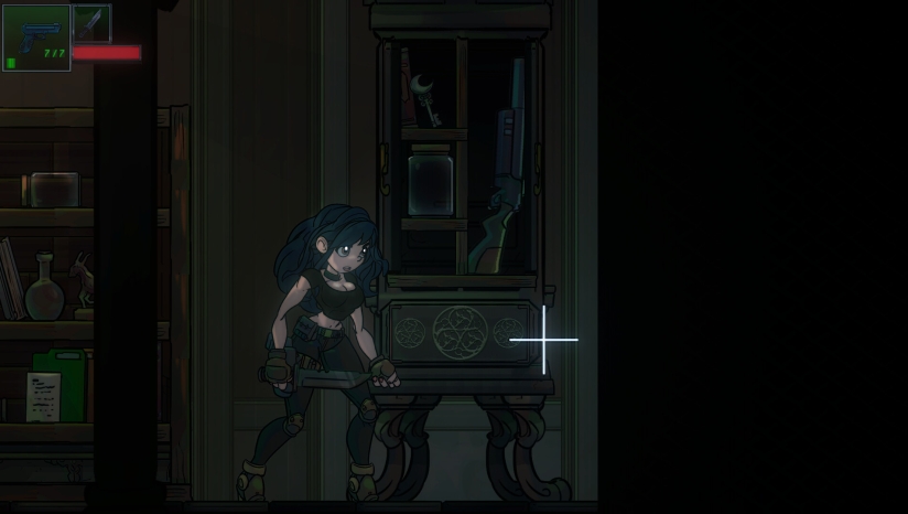 生存恐怖 × 横版探索的创新融合:游戏摒弃了类银河战士恶魔城常见的“无限弹药+高容错”设计,转而采用弹药稀缺、敌人威胁感强的生存恐怖逻辑。每一次开枪都需权衡,近战压制成为常态,玩家必须在“突突突”与“潜行躲藏”之间反复抉择。