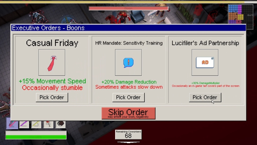 游戏最突出的特色是其充满讽刺意味的职场主题设定,将日常办公元素与恶魔入侵巧妙结合。武器定制系统给予玩家极大的创造自由,可以随意切换或组合基础攻击和进阶攻击,打造个性化的战斗风格。游戏的重玩价值得益于程序化生成的内容,每次体验都独一无二。敌人设计从普通职员堕化而来,包括无脑小鬼和精英小头目,最终需要面对总裁“路西费勒”的终极挑战,战胜后还可解锁无尽模式。