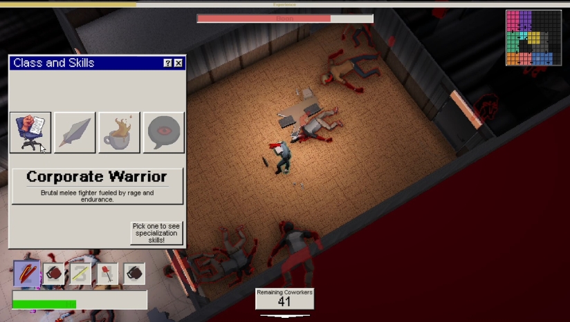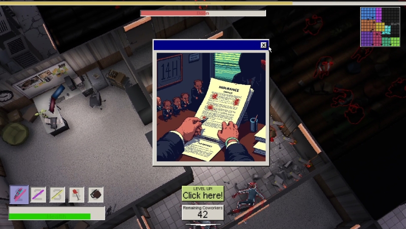 游戏采用快节奏战斗系统,没有技能冷却限制,玩家可以在攻击动画结束后迅速展开下一轮进攻或切换招式。核心玩法包括利用办公用品定制武器,例如能射出回形针的订书机和爆炸喷咖啡的咖啡壶。游戏地图采用程序化生成的办公室楼层,每次游戏都会随机生成不同的楼层、房间和敌人配置,玩家可以探索隐藏房间,迎接意想不到的挑战。通过制作系统,玩家可以组合不同武器部件和攻击方式,打造独特的办公主题战斗工具。