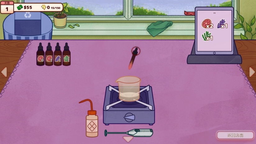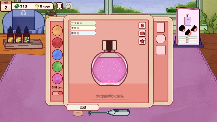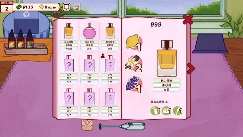 游戏的核心循环围绕香水工坊的经营与调香艺术展开。玩家需要接待性格各异的客人,接收香水订单,随后在实验室中调配专属香水。调香过程极具深度,不仅需要从上百种香材中自由组合,实验出独特的香调,还需要精准把控香料的添加顺序、溶剂比例、温度调控以及搅拌时机。当客人带着特殊需求光顾时,你需要倾听他们的故事,解读他们的情绪,为他们量身定制能够唤起情感的香水。完成调配后,你还可以为每瓶香水命名、设计标签、选择瓶身和包装礼盒,打造完全属于自己的香氛品牌。