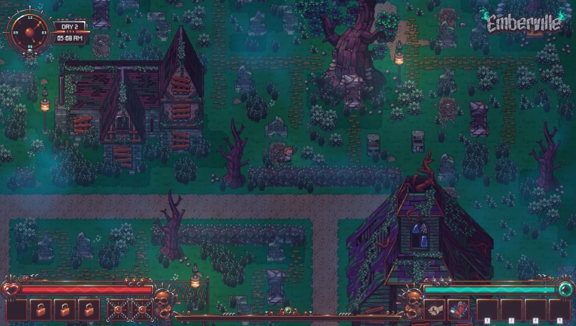 游戏以细致的像素艺术和哥特风格构建视觉基调,手绘画面既保留田园风格的温馨感,又通过阴暗色调烘托神秘氛围。动态光照系统与天气变化强化了场景的生动性,例如风中摇曳的水桶吱呀作响的细节,凸显开发团队对沉浸感的打磨。角色与环境设计兼具复古与现代感,搭配配音演出,进一步提升了游戏的戏剧张力。