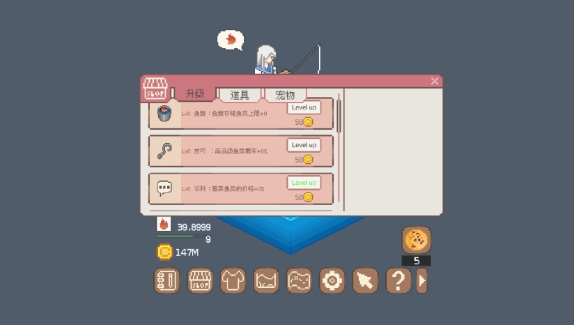 通过鱼缸的收益或者出售鱼来获得金币,花费金币升级你的各项技能。
