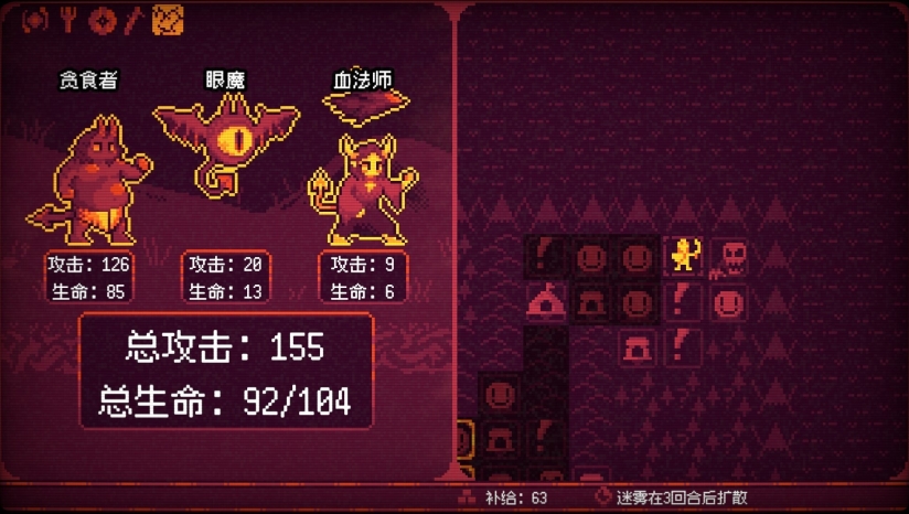 探索地图:在随机生成的地图上,悄然蔓延的迷雾会影响你的每一步,而你需要为团队挑选合适的方格,谨慎前行……明智的决策与把握机会的能力将决定你的冒险之旅的成败。