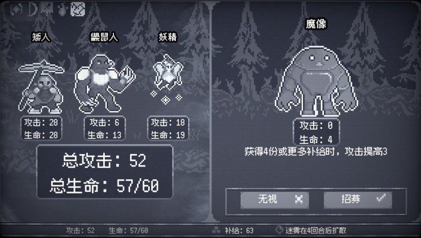 迷雾系统与地图探索:随机生成的地图搭配“魔法迷雾”推进机制,迫使玩家在有限时间内做出决策。进入废墟方格可提升攻击力,踏入事件格则可能触发战斗、补给获取或特殊剧情,路径规划极具策略深度。