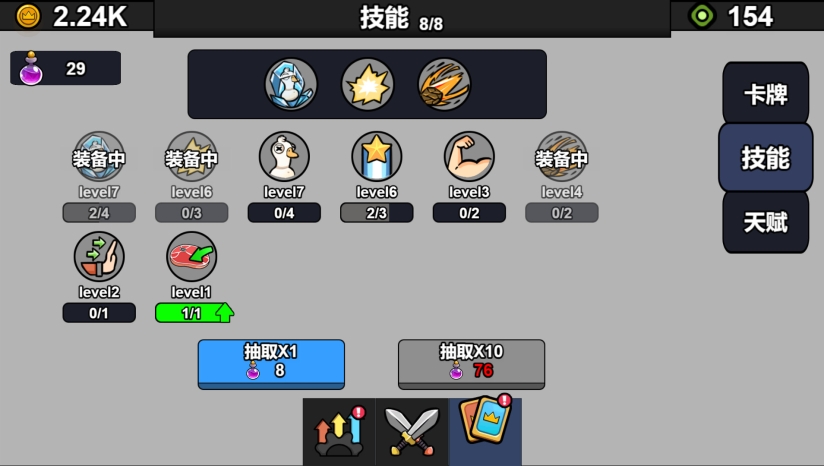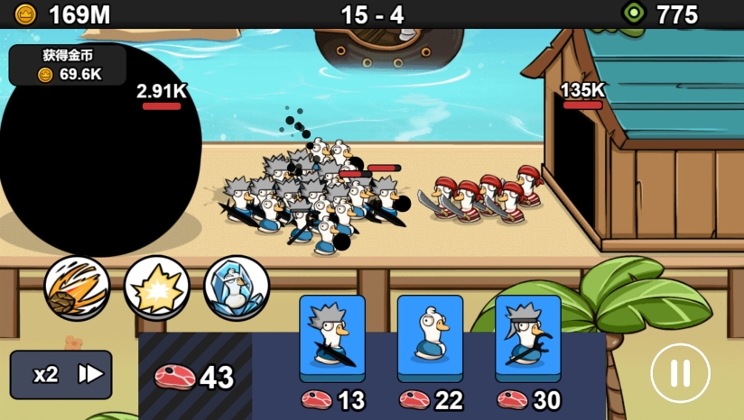 核心玩法是塔防与轻度策略的结合。玩家需要部署鹅群部队,培训近战、远程与超级兵种,合理布置防线。每次出兵需要消耗食物资源,因此提升食物生产速度、强化基地生命值是持久战的关键。战斗中击败敌人可获得钻石,用于抽取能力卡片,卡牌涵盖达芬奇、亚里士多德、亚历山大大帝、拿破仑、爱因斯坦等历史人物,甚至包括猛犸象与霸王龙等幻想生物。