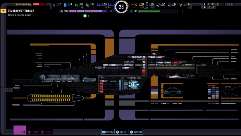 本作是一款剧情驱动的生存策略游戏,融合了Roguelite元素。核心玩法围绕资源管理、探索决策和战斗内容三方面展开。玩家需要通过俯视剖面图管理星舰的各个区域,修复受损的船舱如曲速核心、护盾发生器、维生系统等,每一项建设都需要消耗合金、晶体、能源三种基础资源。探索过程中,玩家需要扫描天体定位资源点,派遣穿梭机采集物资,并在随机生成的星图中规划航线,在最短路径、资源丰富路径和安全路径之间做出选择。战斗分为飞船遭遇战和外出任务两类,前者需要玩家在舰桥指挥视角下分配能源、下达指令、触发船员技能,后者则需要根据任务类型组建技能互补的小队。