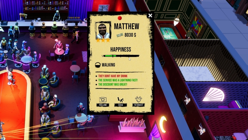 2、经营你的俱乐部:接待 VIP 客人、补充酒吧库存、雇佣舞者,并举办疯狂的主题派对。