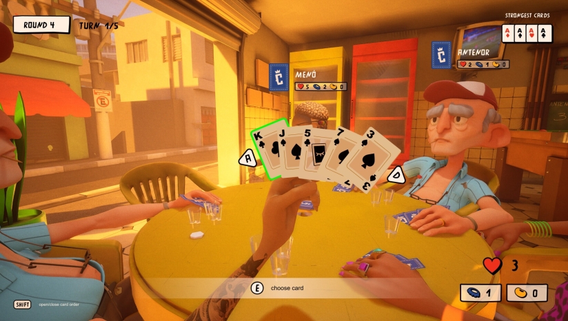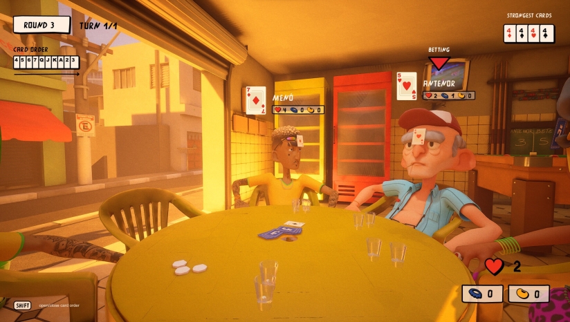 玩家需要先下注自己能赢得的抓分数量,然后一轮轮出牌,力求正好命中赌注。如果赢得的抓分比下注多或少,每差一分,就得喝一杯虚拟“酒”。喝满四杯,你就出局了——Capotado!