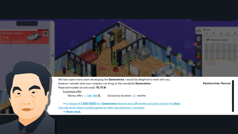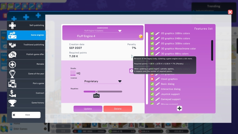 但有一个问题:即使您的游戏很出色,您也没有足够的粉丝来自主发行大型游戏,使工作室盈利。您将不得不求助于游戏发行商,他们会分走大部分利润。只有不断取得成功,才能摆脱发行商的束缚。之后,您将能够发布自己的发行合约。届时,您就可以主导市场并收购竞争对手了。开发或租用游戏引擎