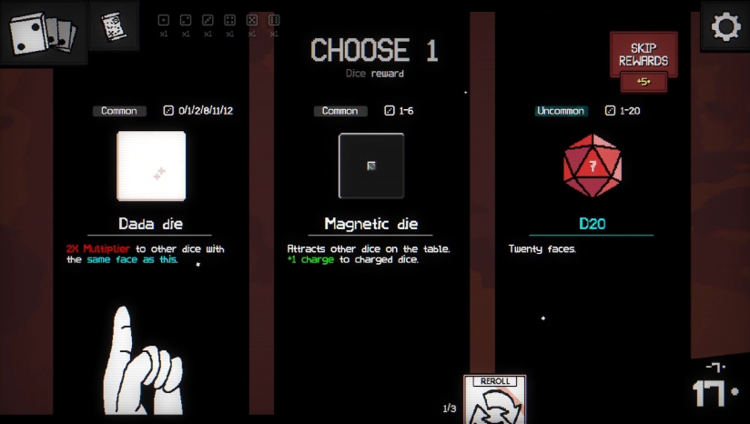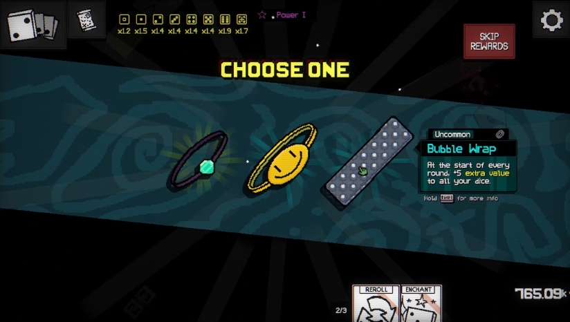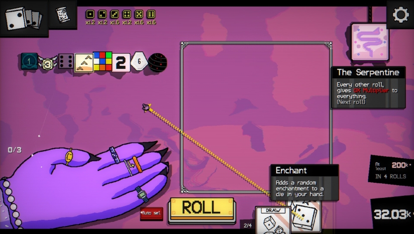 商店与升级系统:每局中可访问商店,购买新骰子、升级现有骰子面值、附魔强化效果(如“触发两次”“不占手牌”),并利用金币优化整体构筑。初始骰子较少,但可通过策略性投资快速滚雪球。